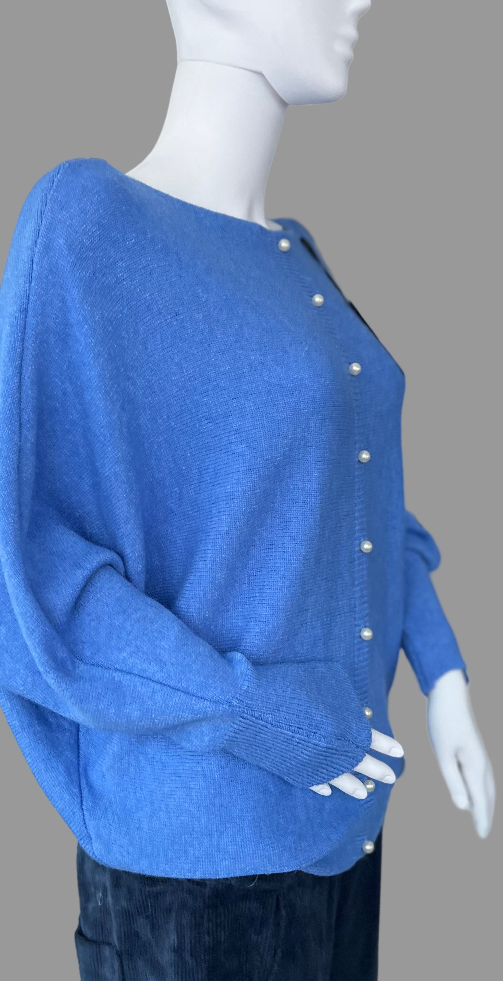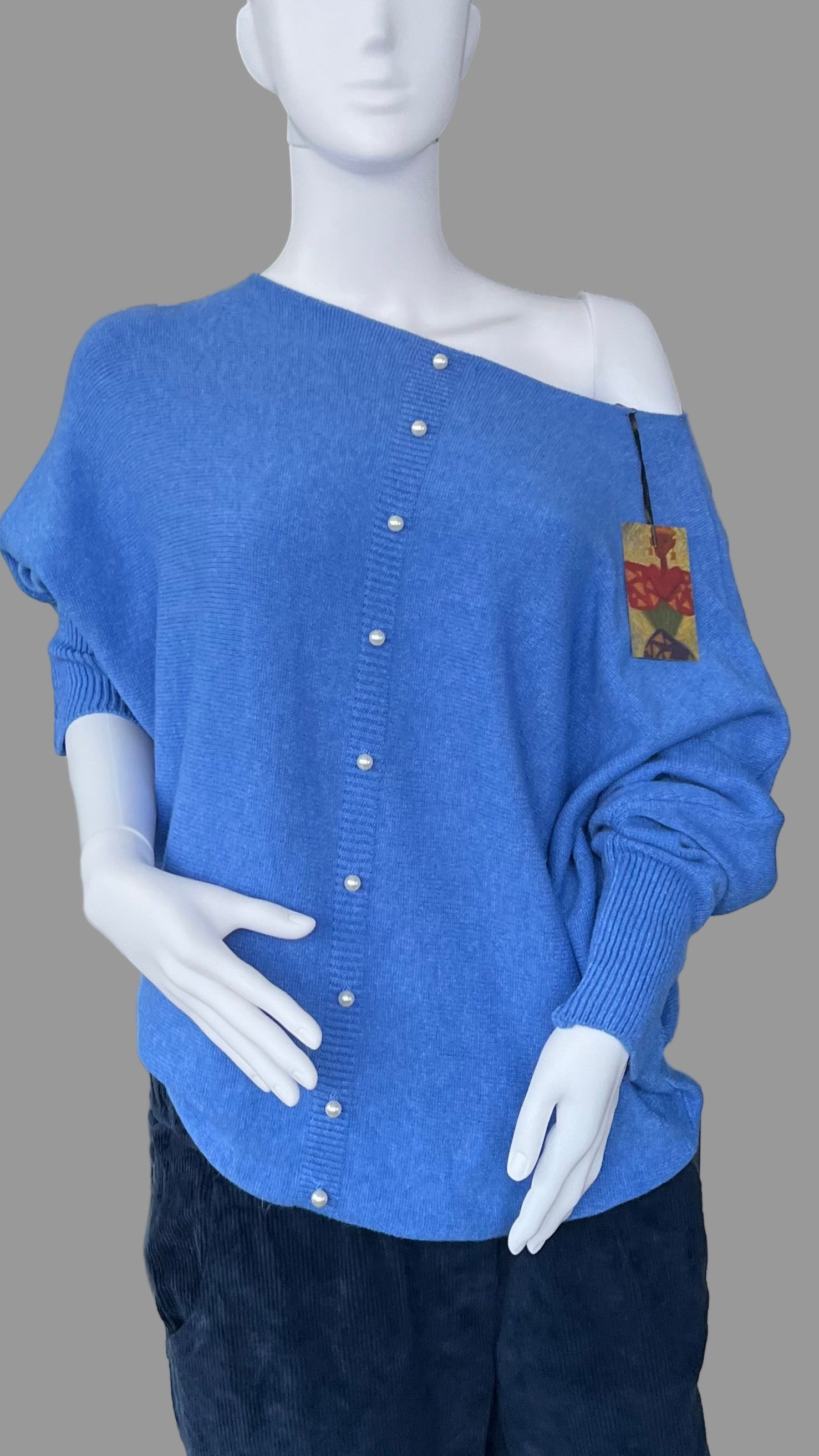 Denim blue jumper with elegant pearl detailing on the back