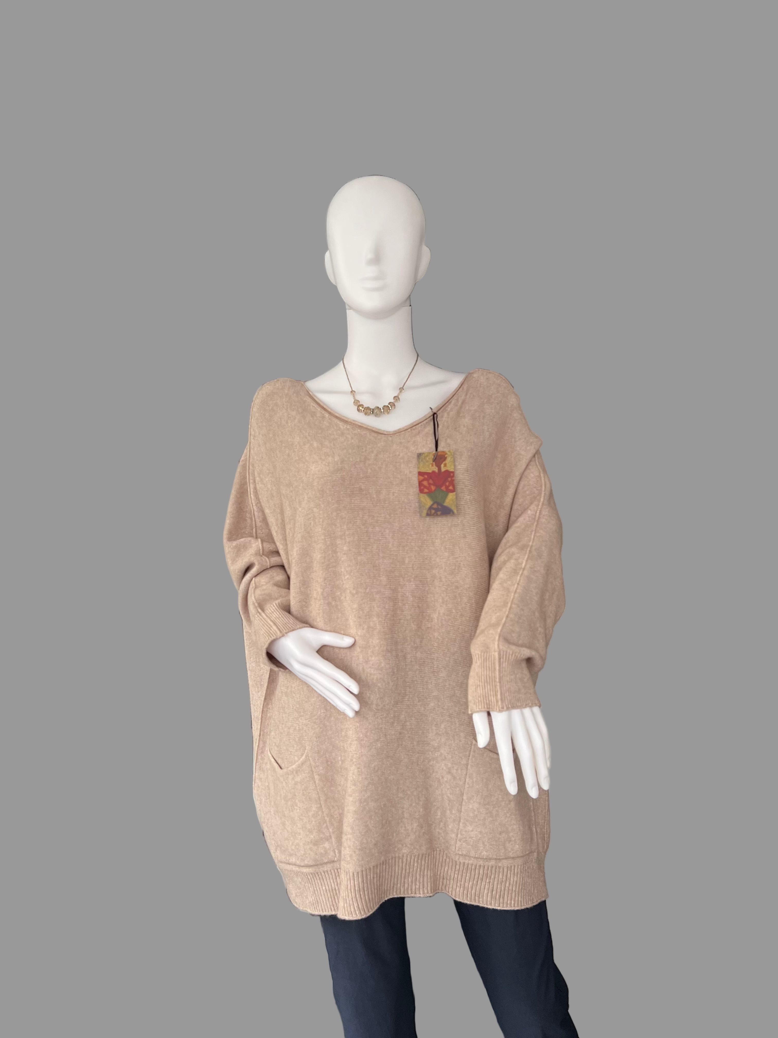 Oversized Fine Knit Jumper Relaxed Fit Beige Plus size Sweater with Pockets